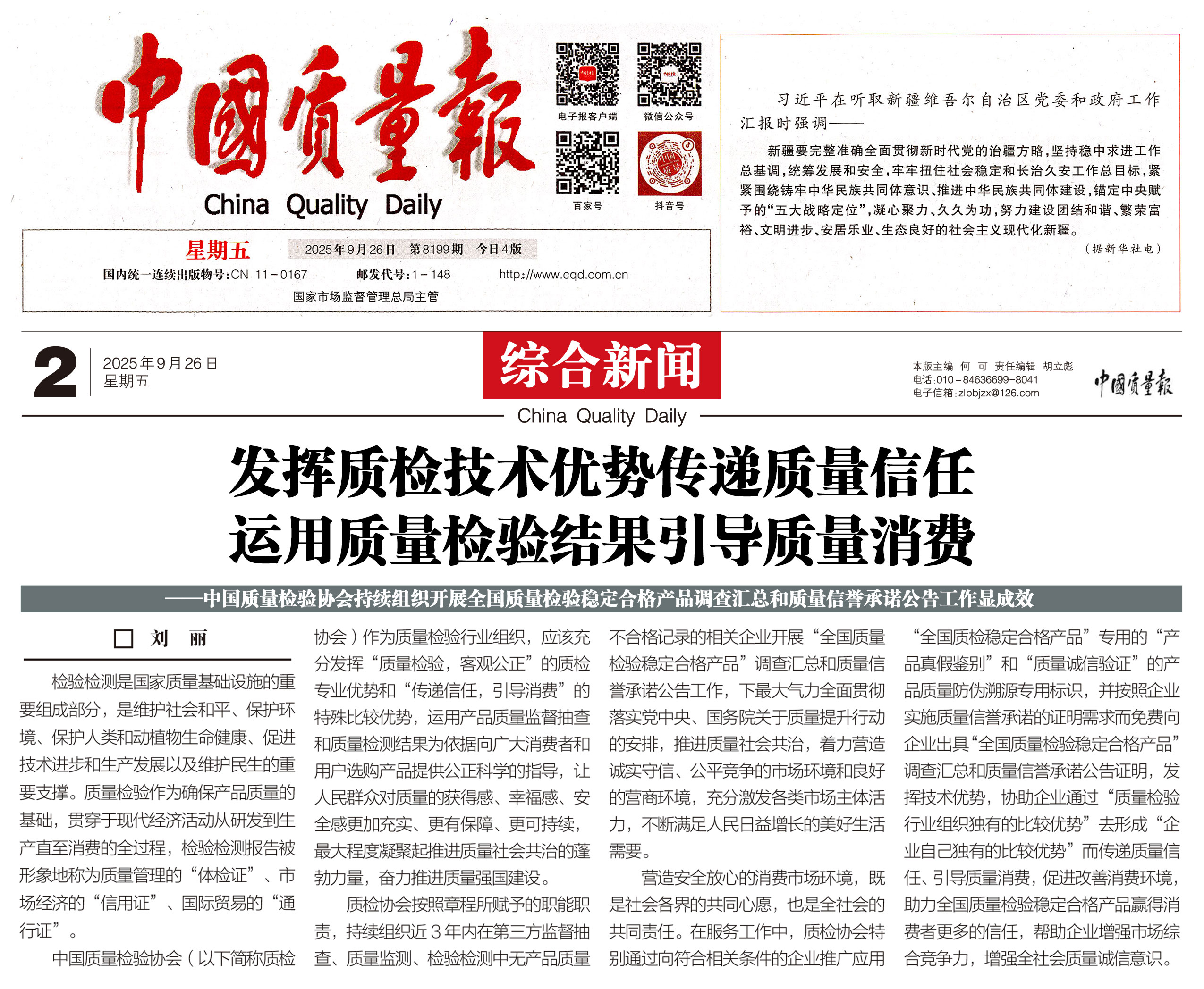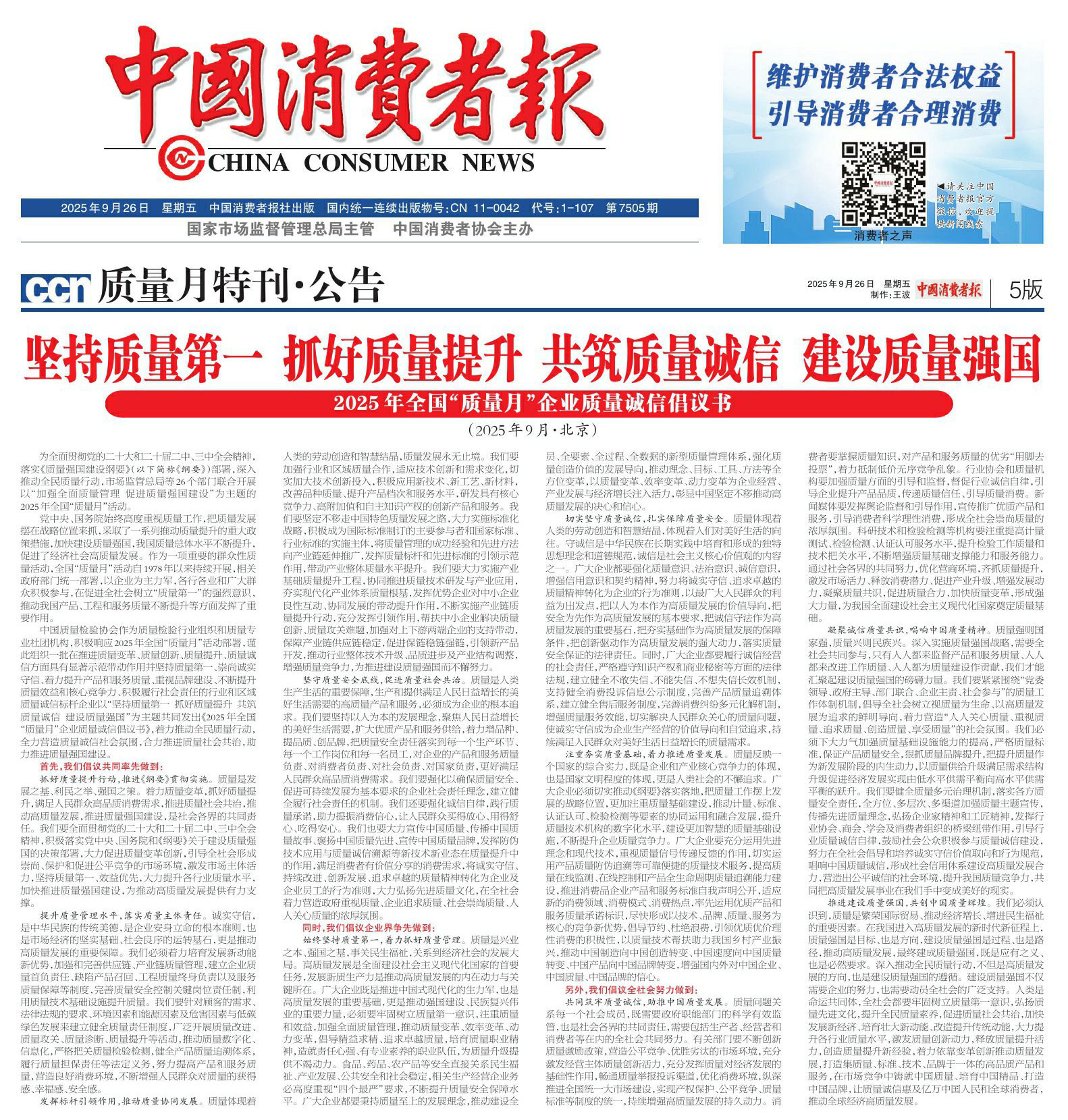 - 《中國質(zhì)量報(bào)》(2025年9月25日刊)發(fā)布:堅(jiān)持質(zhì)量第一 抓好質(zhì)量提升 共筑質(zhì)量誠信 建設(shè)質(zhì)量強(qiáng)國——2025年全國“質(zhì)量月”企業(yè)質(zhì)量誠信倡議書(2025年9月·北京)