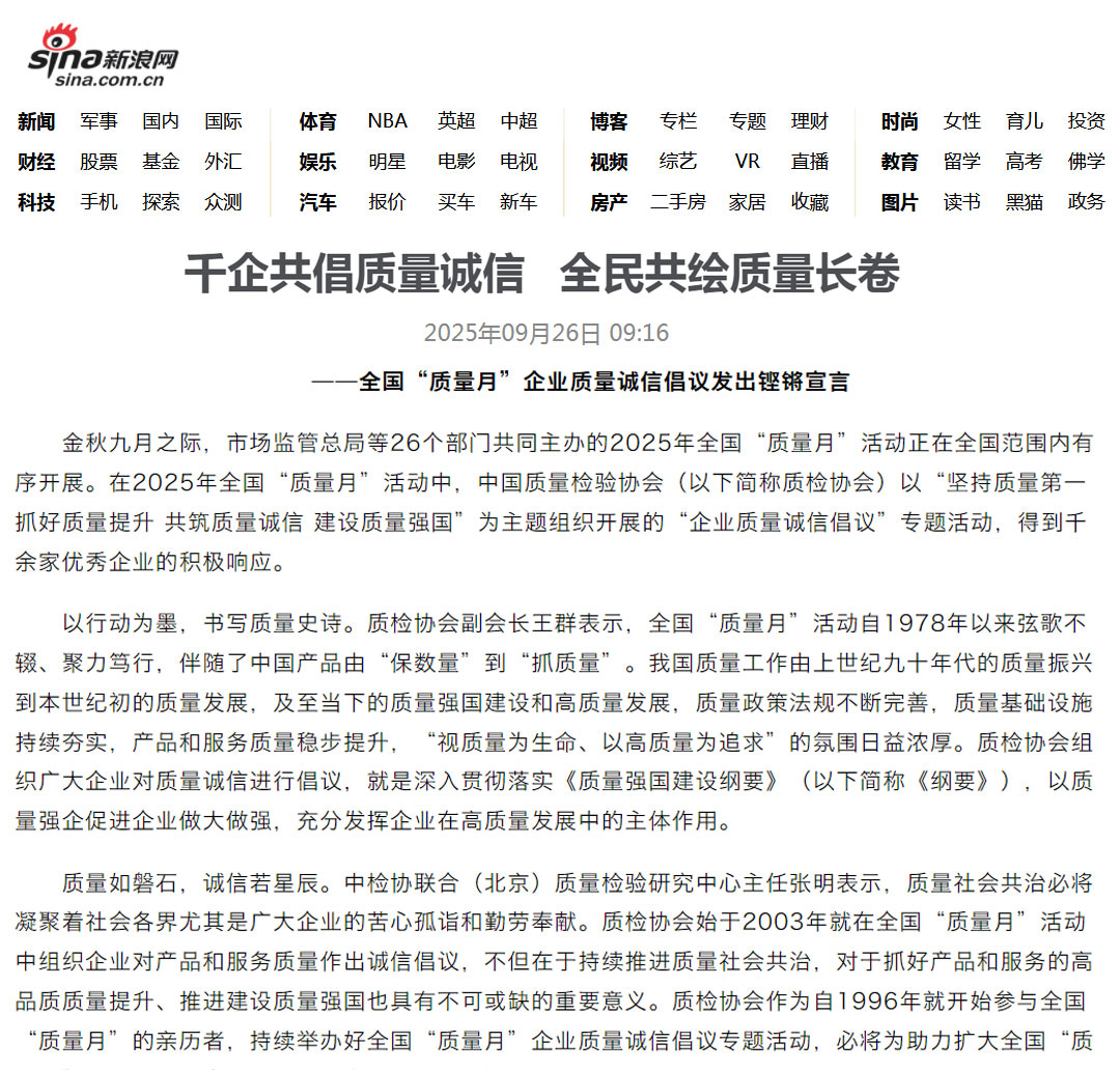 - 新浪網(wǎng)報(bào)道——千家企業(yè)發(fā)出倡議:視質(zhì)量為生命 以高質(zhì)量為追求——中國質(zhì)量檢驗(yàn)協(xié)會組織開展2025年全國“質(zhì)量月”企業(yè)質(zhì)量誠信倡議活動