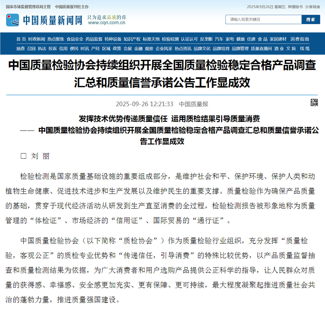 - 中央廣播電視總臺央廣網(wǎng)報(bào)道——中國質(zhì)量檢驗(yàn)協(xié)會組織開展2025年全國“質(zhì)量月”企業(yè)質(zhì)量誠信倡議活動